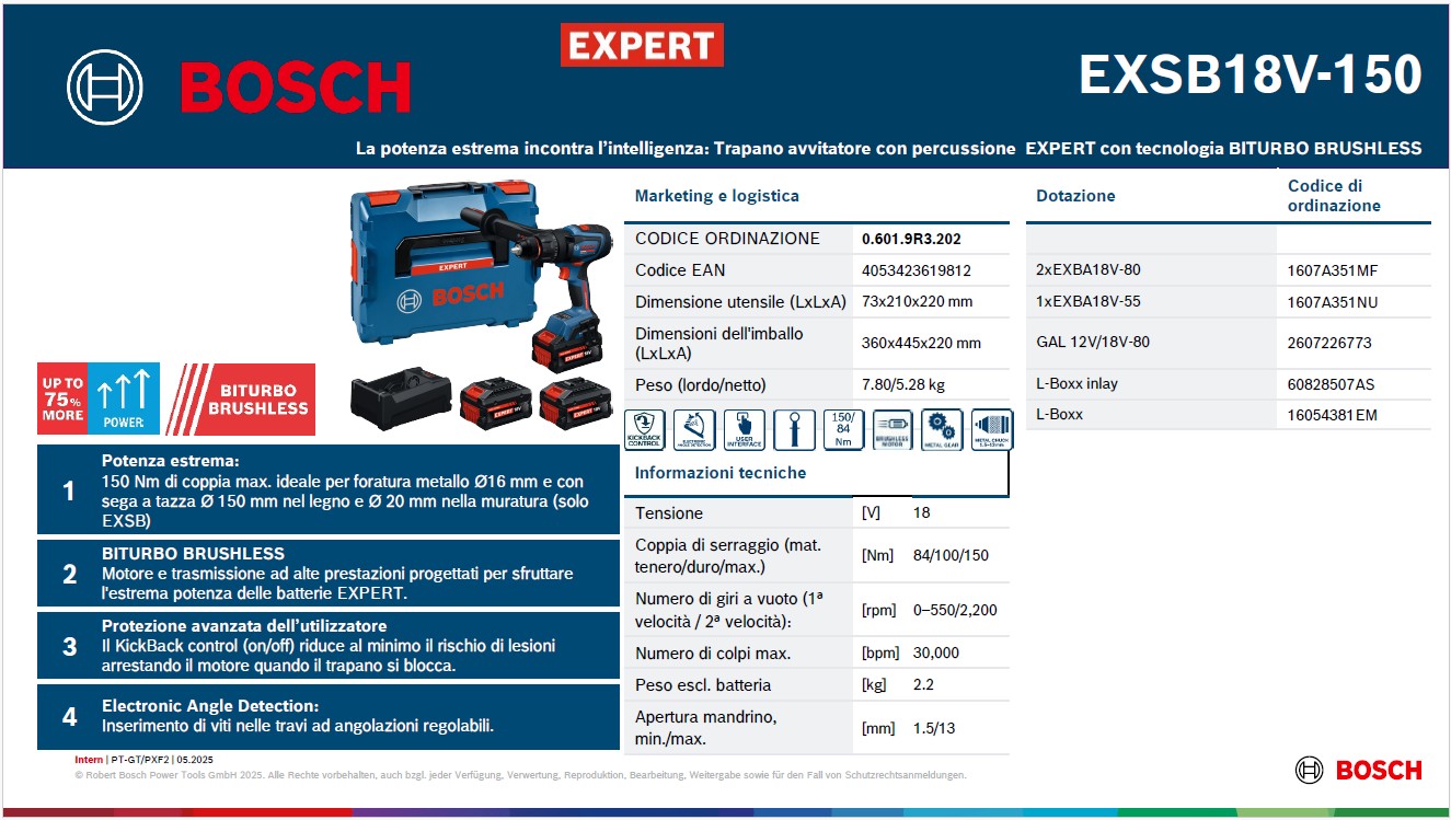 En résumé, la Bosch Expert EXSB18V-150 est une perceuse-visseuse professionnelle pratique et polyvalente, idéale pour ceux qui recherchent un outil unique pour percer et visser simplement, précisément et sans effort.